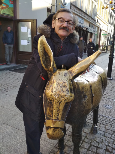 Jerzy Targalski na Rynku Staromiejskim w Toruniu, z uśmiechem, który rzadko gościł na Jego twarzy, rok 2018
